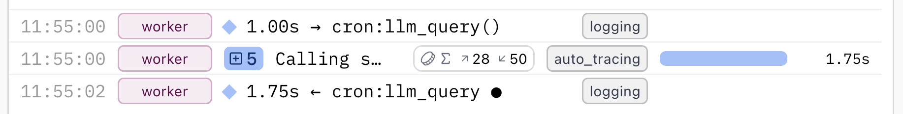 Spans let you add context to your logs and measure code execution time. Multiple spans combine to form a trace, providing a complete picture of an operation's journey through your system.