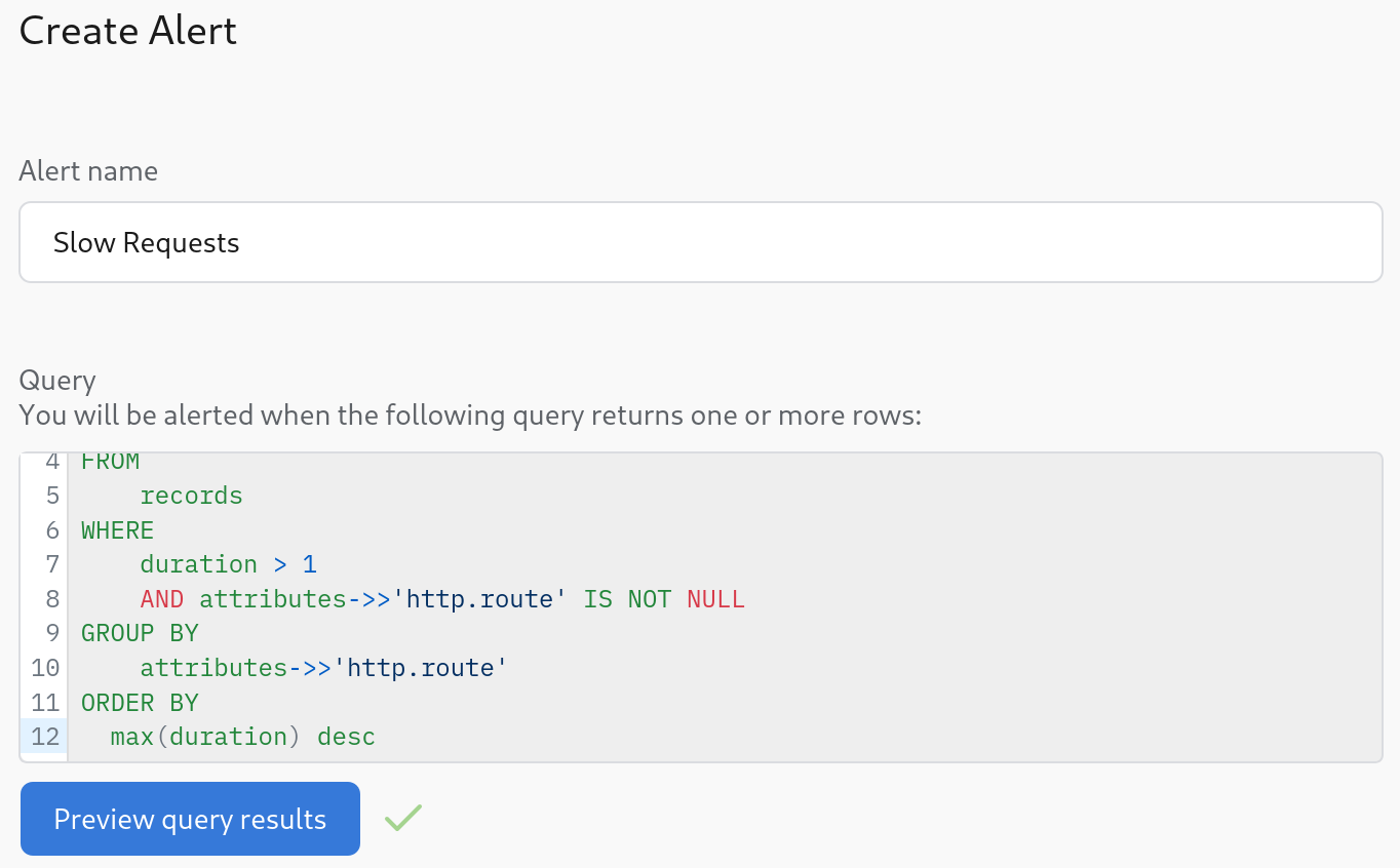 We'll create an alert that will let us know if any HTTP request takes longer than a second to execute.